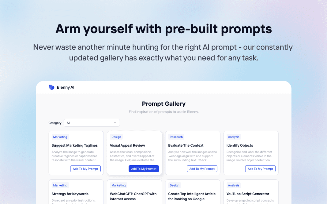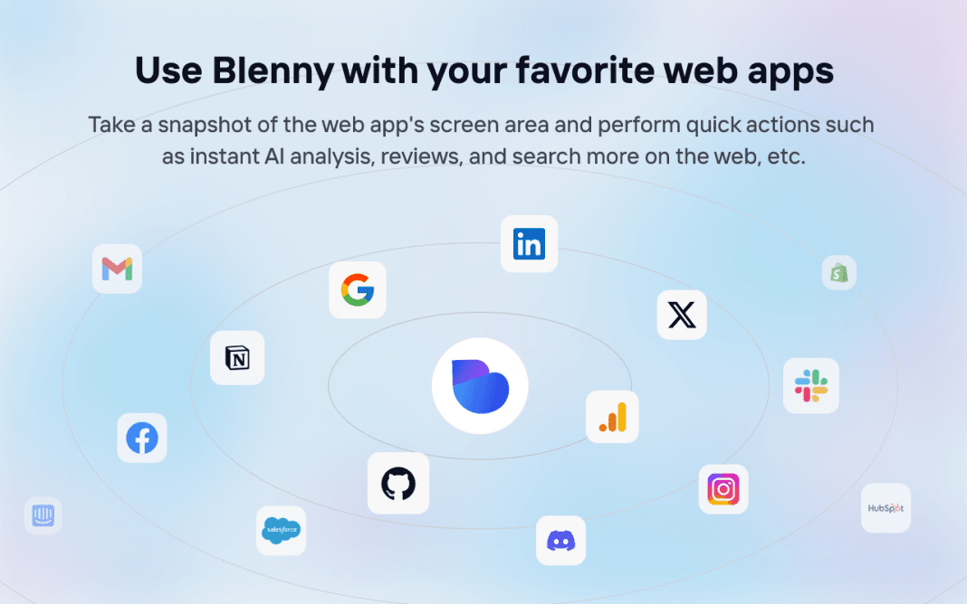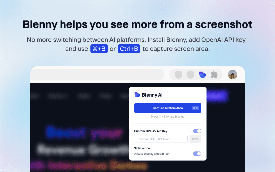 Blenny AI’nın Chrome eklentisi, ekranınızdaki herhangi bir bölgeyi seçerek anında analiz yapmanıza olanak tanır. Peki, nasıl çalışıyor? Ekran görüntünüzü alın, Blenny’ye bırakın ve içeriğinizin özetini, kelime çevirilerini veya nesne tanımlarını saniyeler içinde görün. Bu kadar basit! 😍 Üstelik özelleştirilebilir yapay zeka ajanlarıyla kendi ihtiyaçlarınıza göre görevler oluşturabilir, Prompt Galerisi aracılığıyla geniş bilgi kaynaklarını verimli bir şekilde kullanabilirsiniz.